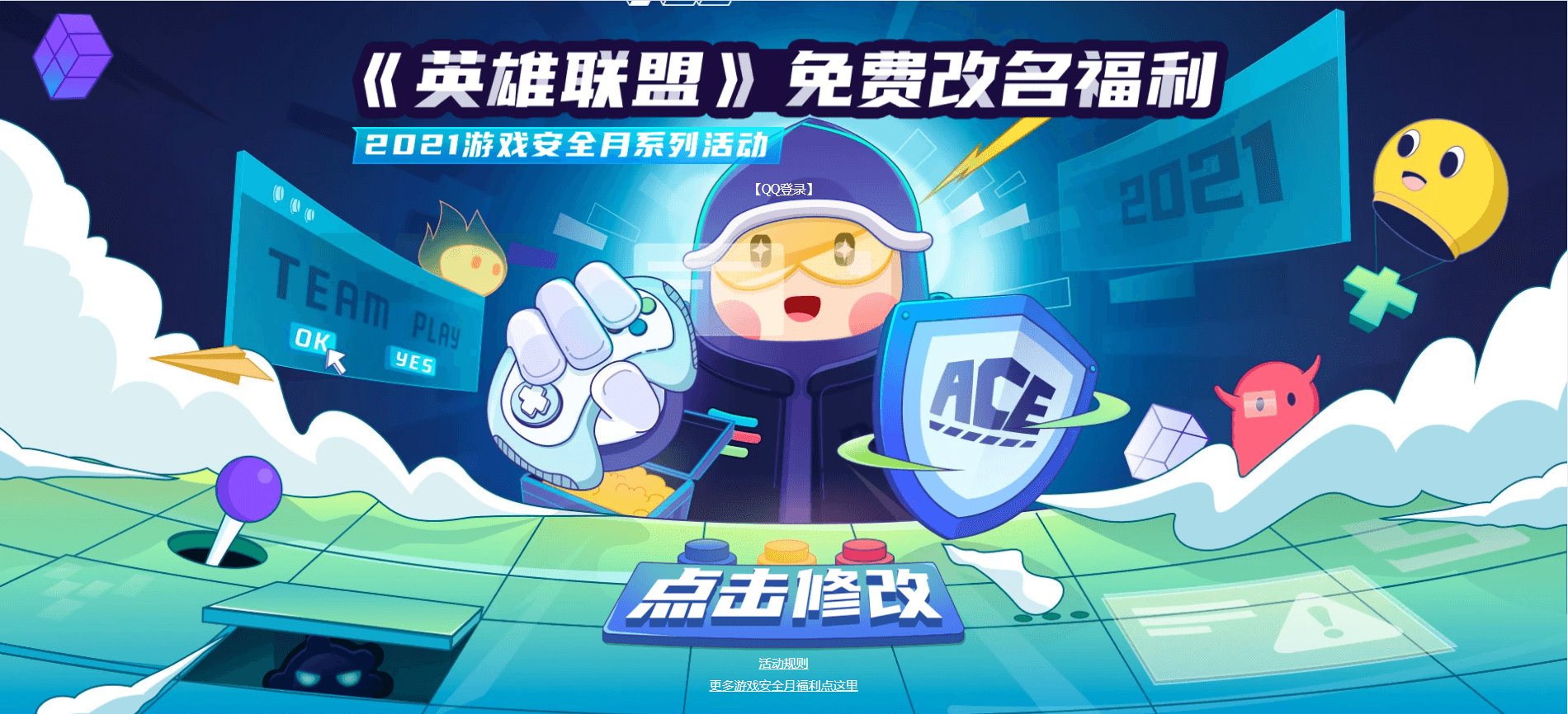 在游戏安全月活动期间内,每个QQ账户下的每个游戏大区角色,可以在活动页面进行一次免费改名。所有的改名机会均只在本活动期间内有效,免费改名将遵守改名系统的所有规则,改名卡下架期间不可使用改名机会。