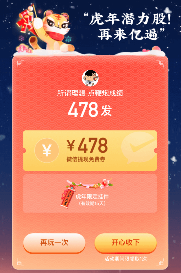 5、活动奖励:点鞭炮完成后,用户可领取微信提现免费券和虎年限定挂件;