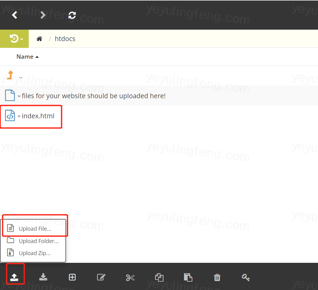 按照上图所示进入文件上传管理页面,老夜图省事直接上传了一个html单文件,其实对于支持PHP+Apache+MYSQL的网站程序都是完美支持的,对于复杂一点的建议使用FTP工具上传