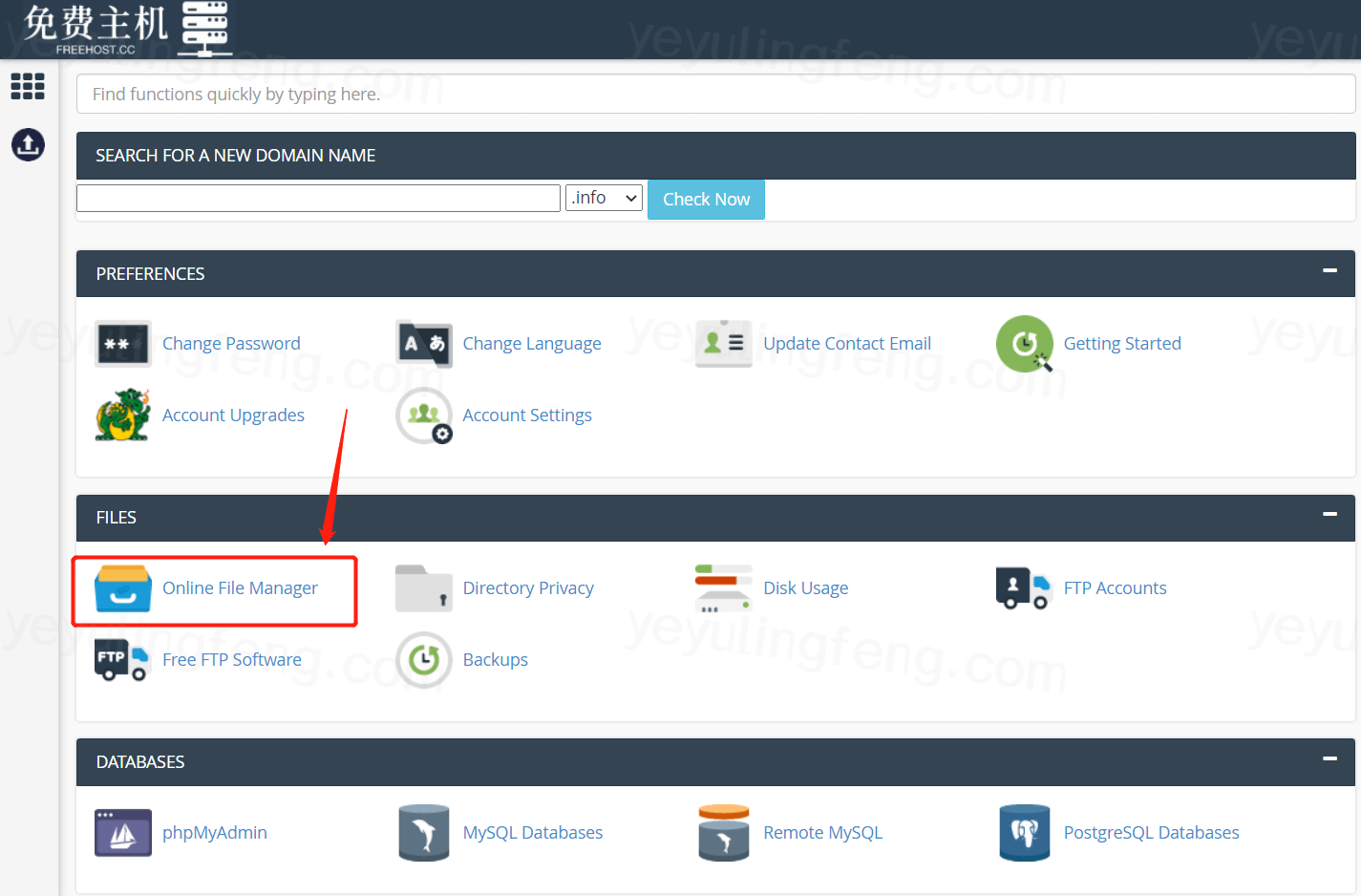 数据库、FTP懂的都懂,不懂的一时半会也扯不清楚了,小白直接打开面板地址(http://cpanel.freehost.cc/)