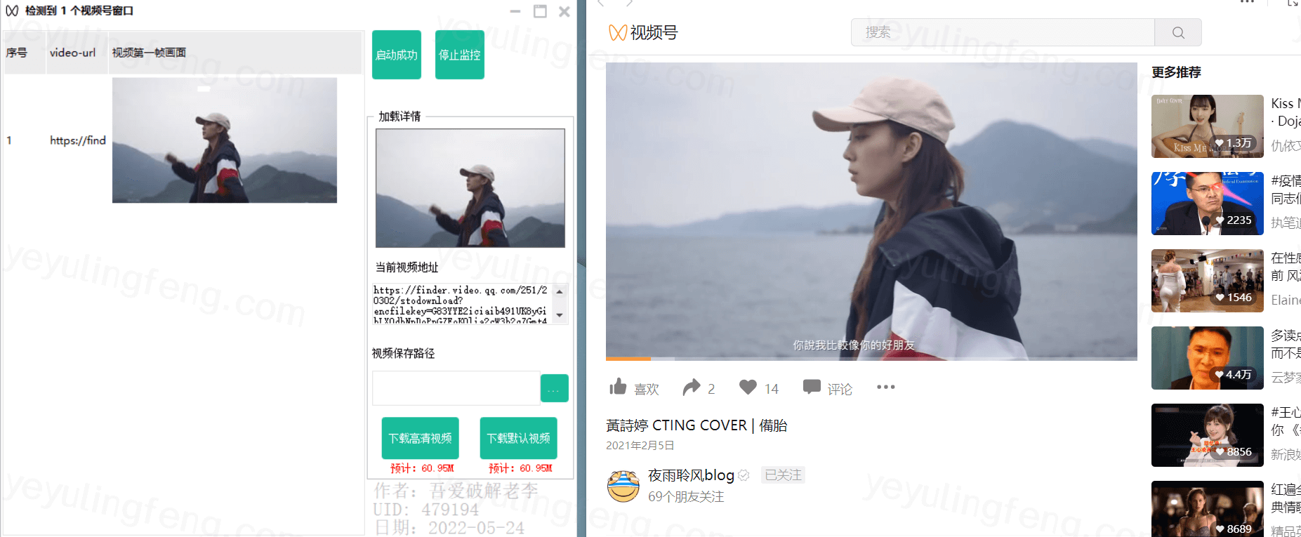 需要嗅探的时候,点击“开始监控”,然后播放视频号中的视频就能在工具中捕获到视频源地址了,由于嗅探时候可能会加载很多无效的视频地址,所以在需要嗅探的时候 “开启监控”,不需要的时候“停止监控”,当然不停止也没事,左侧加入了视频帧画面,可以快速选择自己想要的那个视频
