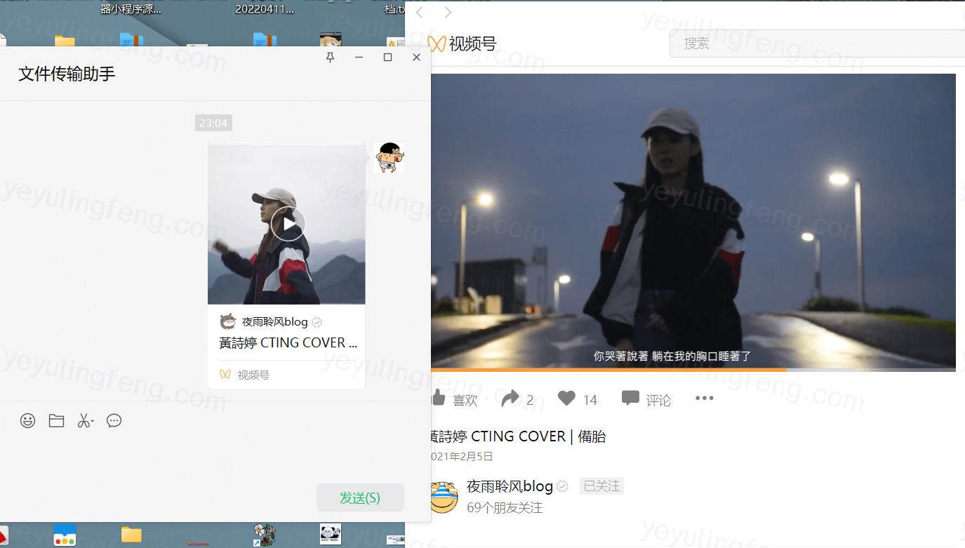 PC端的微信貌似没有视频号的入口,这里我们可以如上图所示,将手机中的视频号内容分享至文件传输助手或者自己的怨种好友,这样就能在电脑上看视频号内容了,同时也方便视频号下载器的资源嗅探