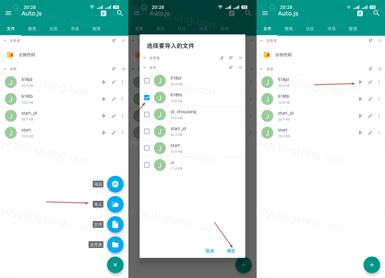 需要将文件夹中的js文件按照下图所示导入至Auto.js APP中,然后点击运行,在所以权限允许情况下脚本就会立即执行了