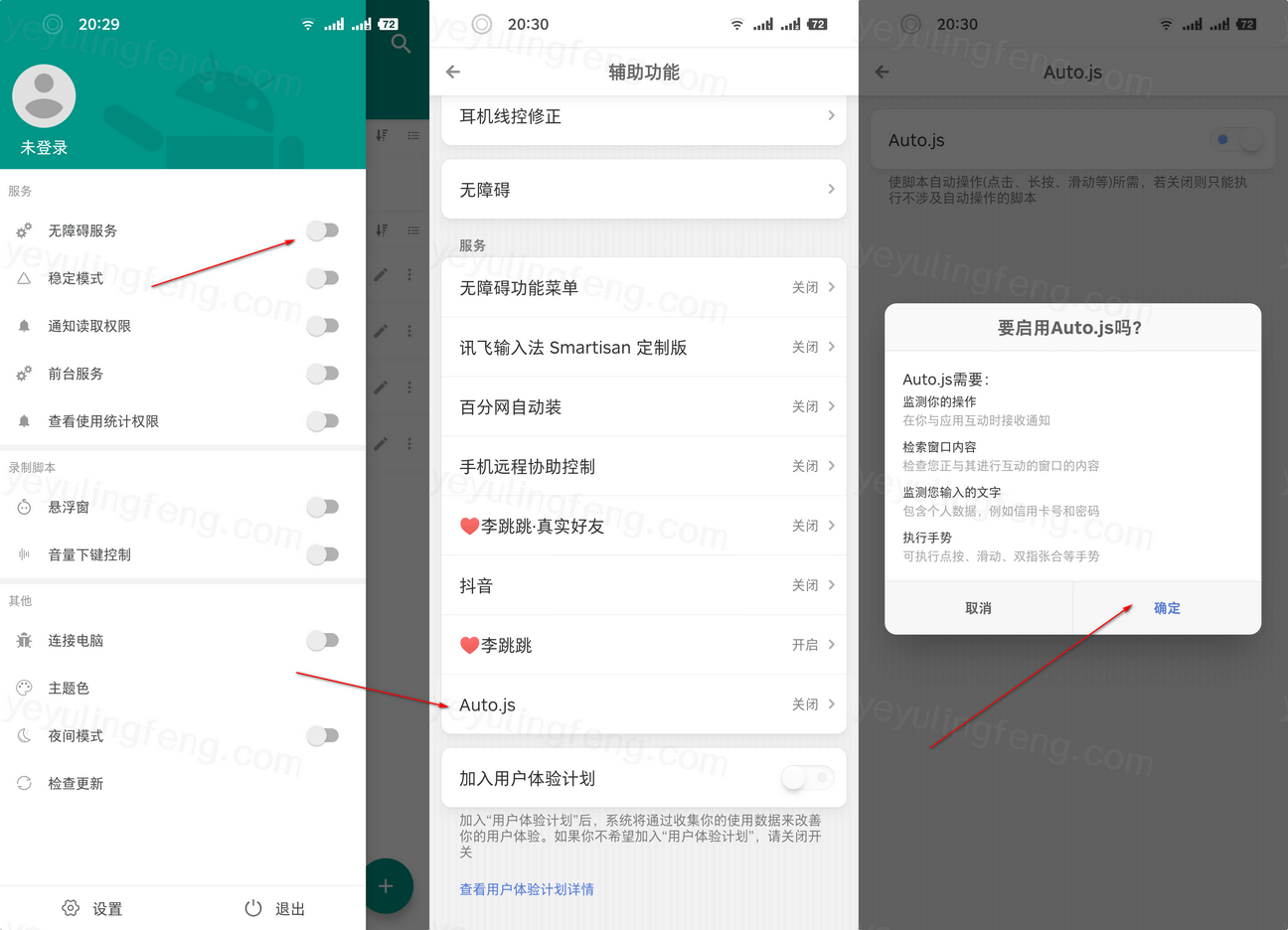 默认软件操作时会有弹窗提示打开无障碍开启引导的,如果没有弹出直接按照上图所示手动开启,不然无法正常启用辅助工具