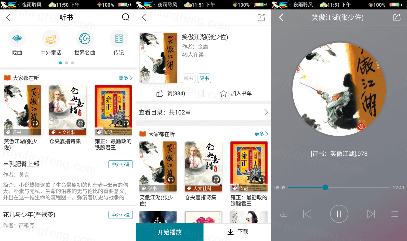 听书以戏曲、名著、诗歌居多,支持一键下载至本地