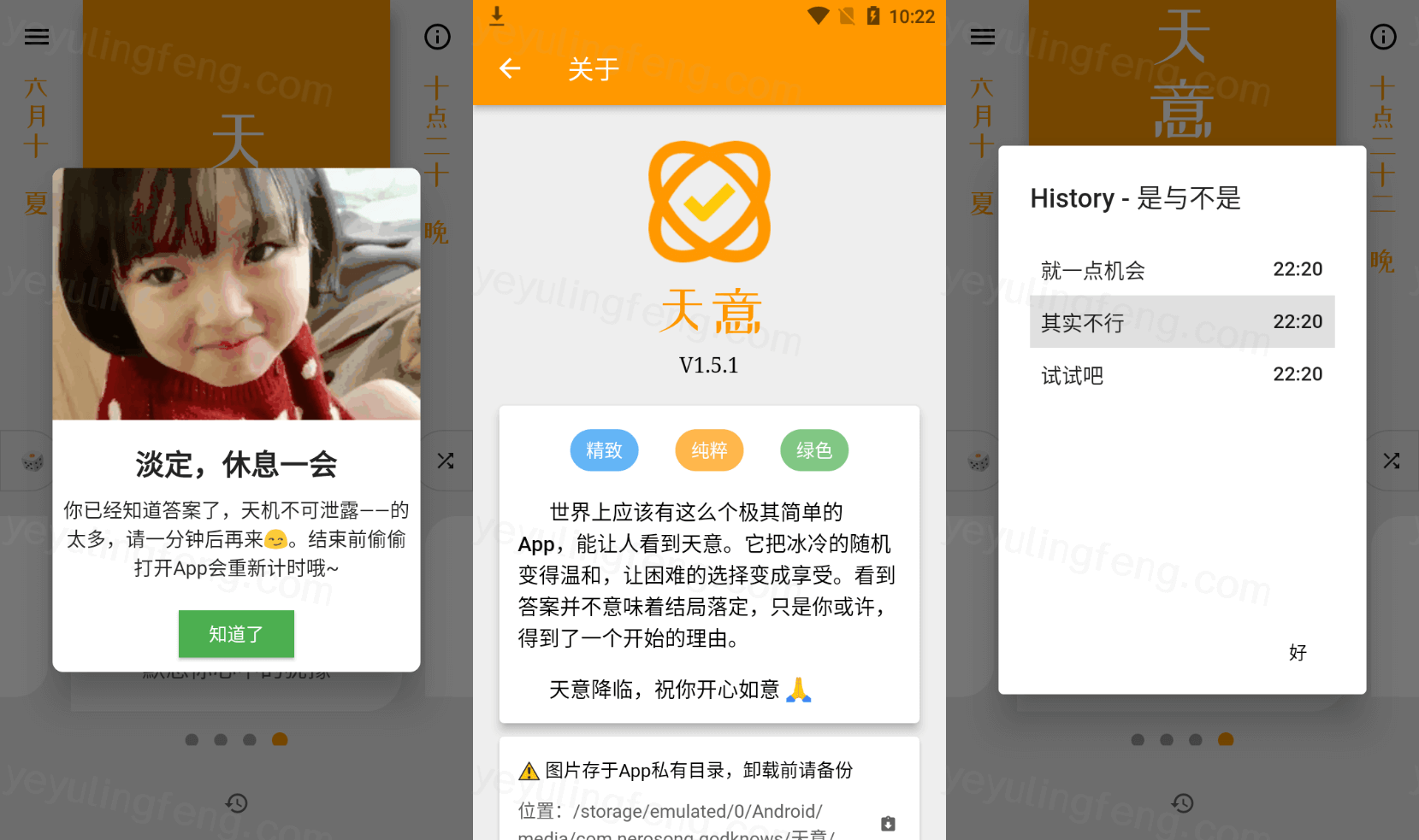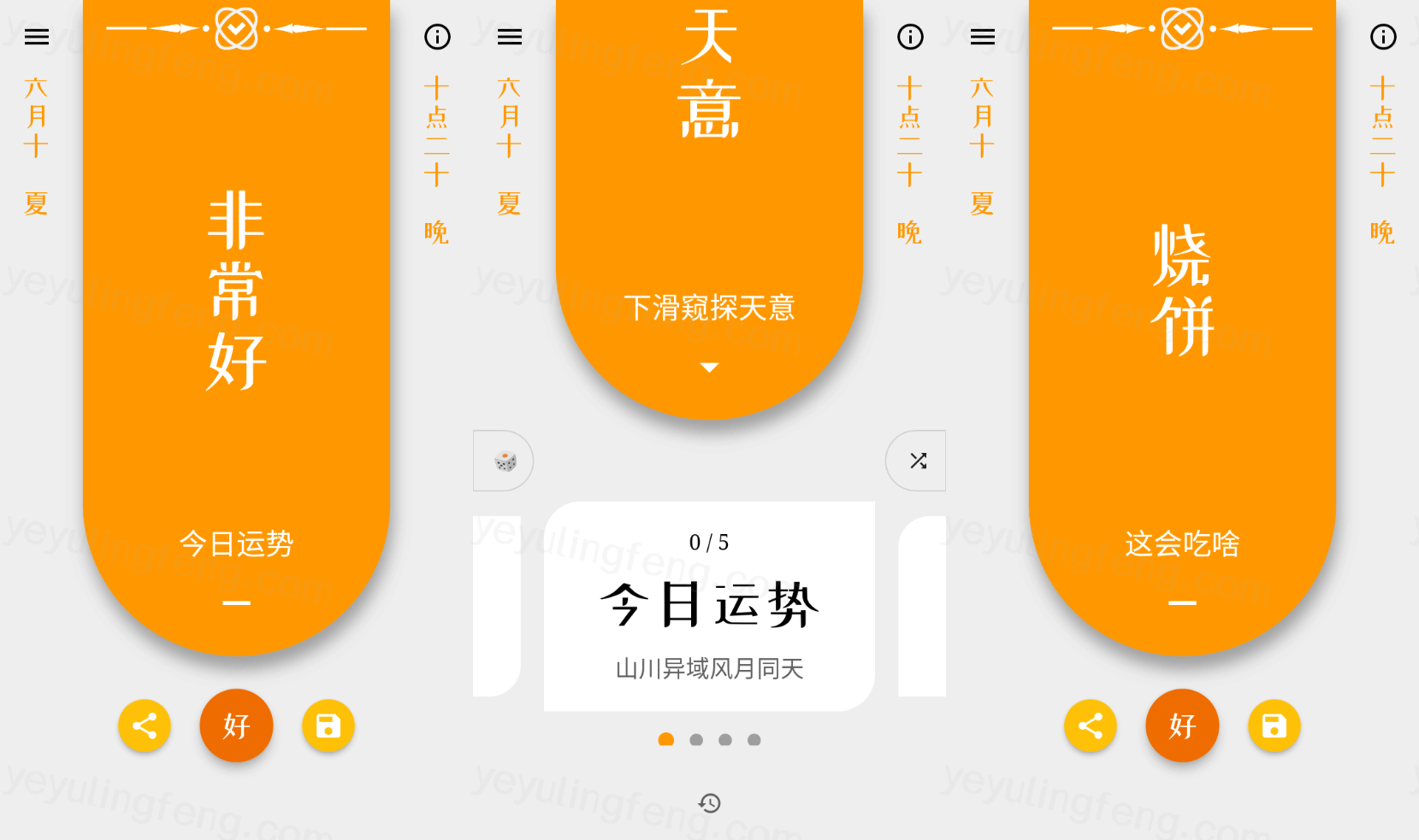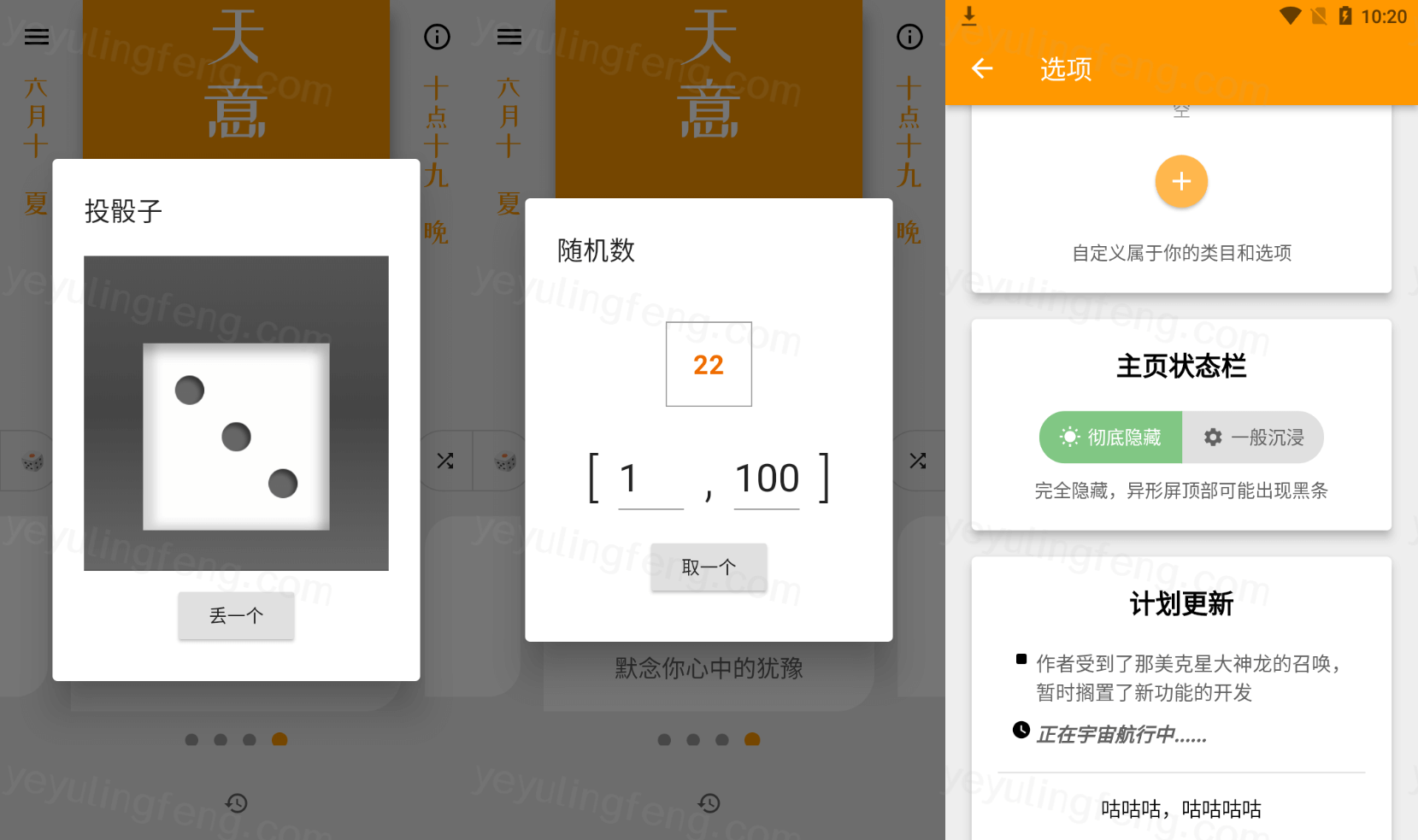 优雅直接的交互,精美流畅的动画,还有神秘浮现的下一个答案……毫秒启动,瞬时响应,随时随地窥探上帝掷下的骰子。自带“今日运势”、“这会吃啥”、“休息片刻”和“是与不是”四大常用主题,以及N多有趣的回答。当然还可以自定义类目和选项,创造只属于你的天意。