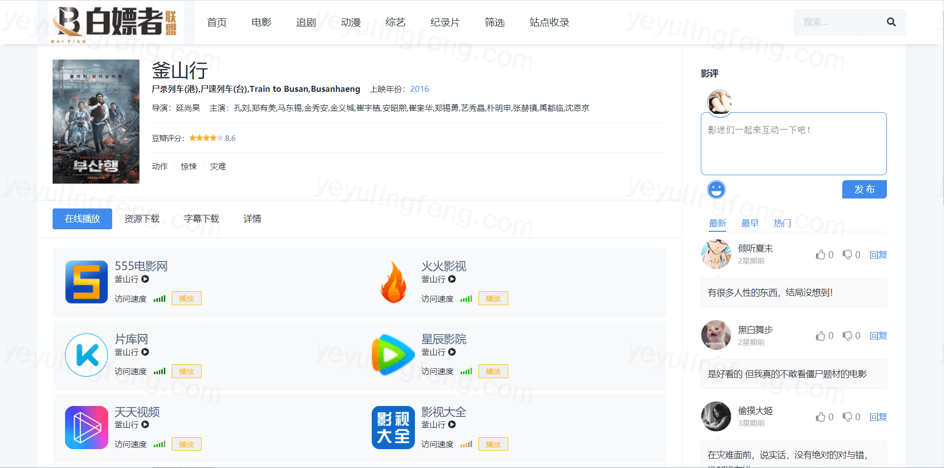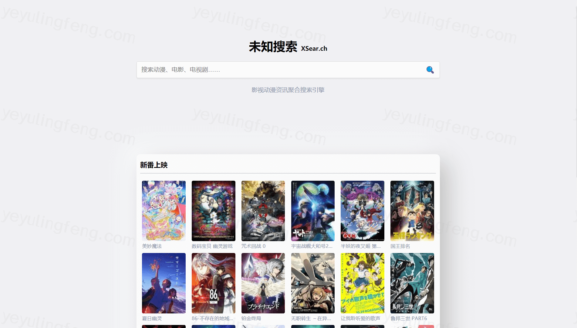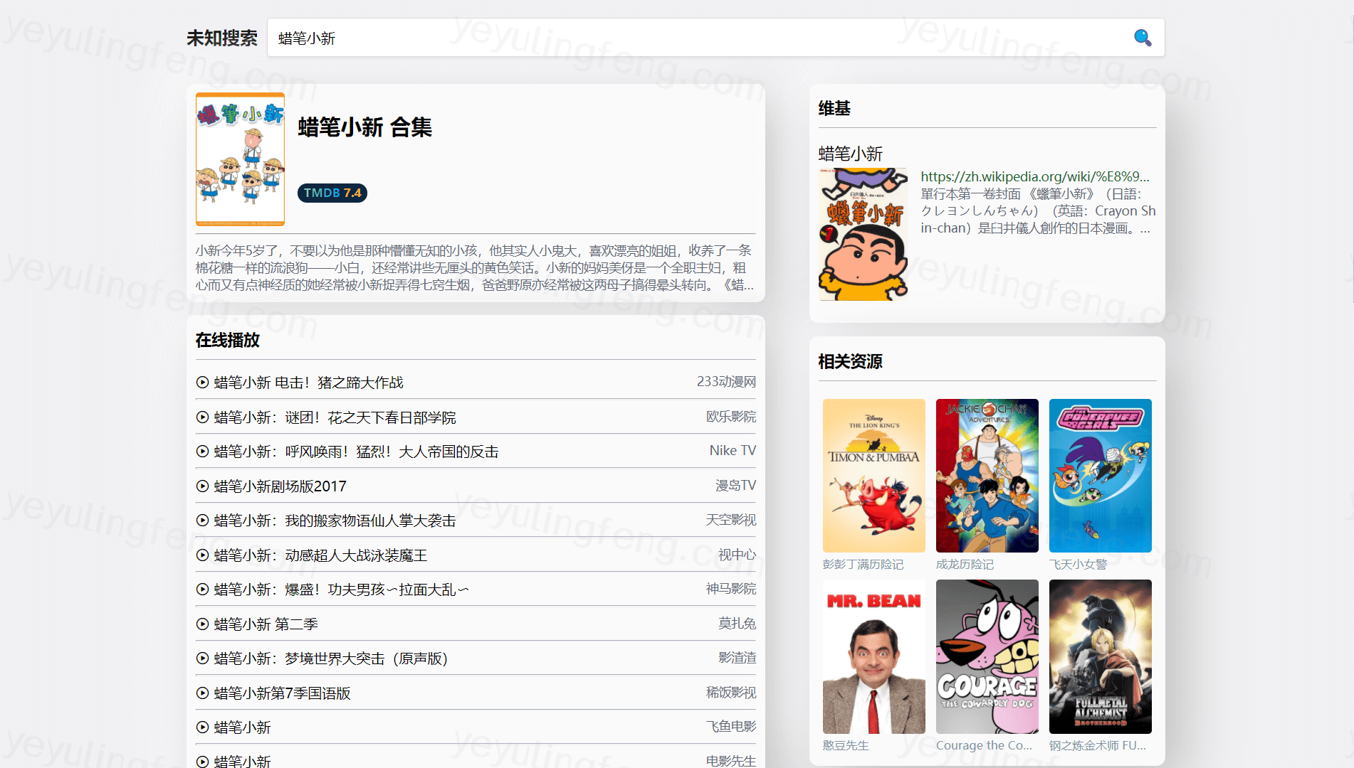切回至主题,今天分享的网站就很取巧,自己不提供任何的影视资源,包括播放页都不带提供的。就是简单的把网络中的免费网站的资源做了一个整合,理解为专门的影视搜索引擎就差不多了。电影电视连续剧综艺番剧等都是输入想要找的资源就能快速的找到来源的站点,点击去就能在线观影。