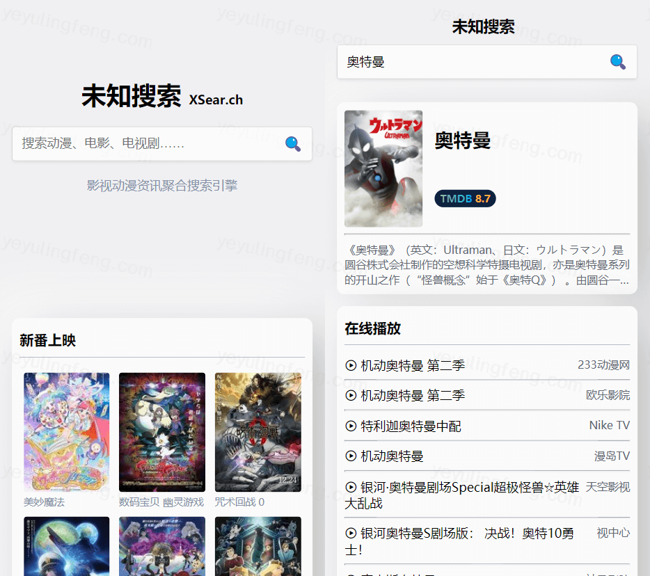 XSear又叫未知搜索,首页还贴心的附上一些新番的信息来迎合年轻的用户群体,点击就能看到各种在线播放来源