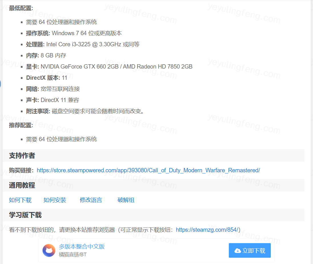 随意点进去一个在页面详情还能看到最低配置说明以及官方的游戏购买链接