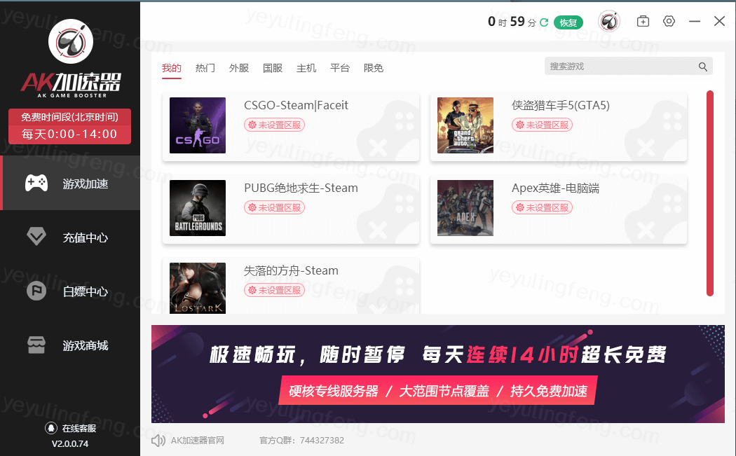 支持国内外以及主机游戏的加速,主流热门游戏基本上都在列表中了,注册登录后默认就送一个小时,1个小时是加速时间,不使用服务的话是不扣除的,如果是在免费加速时间段就不会扣除时长了