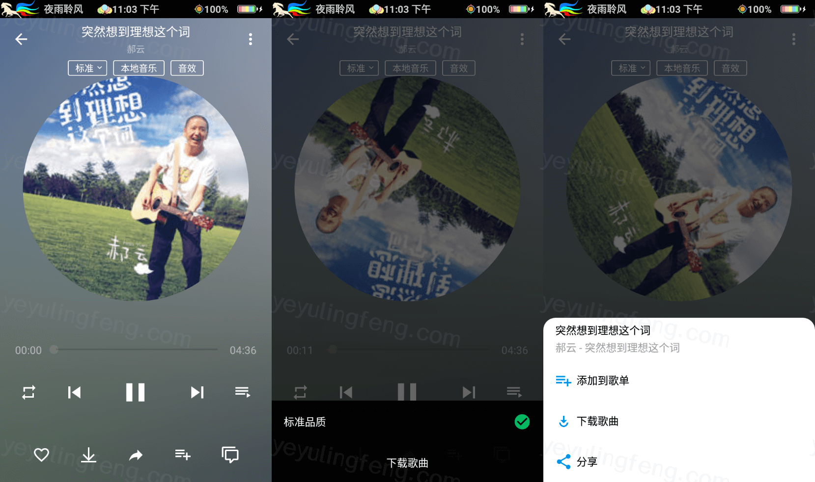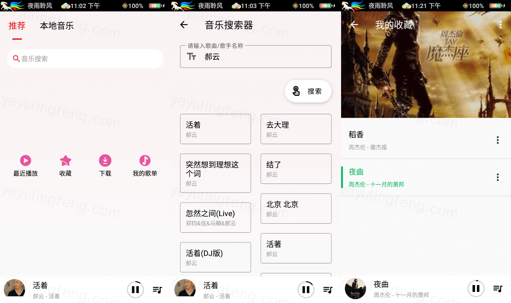 播放时支持收藏、歌单管理,目前获取不到歌词也不支持音质切换,但界面都有显示模块,估计作者有后期填充的打算