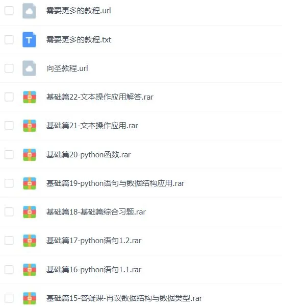 这些资源我都已上传到公众号上,后台回复「python资料」,即可获取。上面只是列举出 10 个资源,我分享的一共有 18 个资源,全是和 Python 相关的。资源来自网上,如有侵权请及时后台联系我,我去删除。资源搜集不易,有些是痴海花钱买来的,现在全部免费送给大家。希望在座的读者,以后都能成为技术大牛!