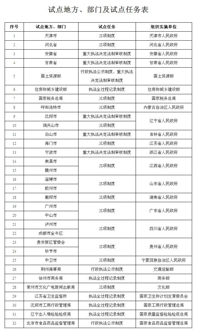《方案》确定在天津市、河北省、安徽省、甘肃省、国土资源部以及呼和浩特市等32个地方和部门开展试点。各试点地方和部门在行政许可、行政处罚、行政强制、行政征收、行政收费、行政检查六类行政执法行为中推行行政执法公示制度、执法全过程记录制度和重大执法决定法制审核制度。