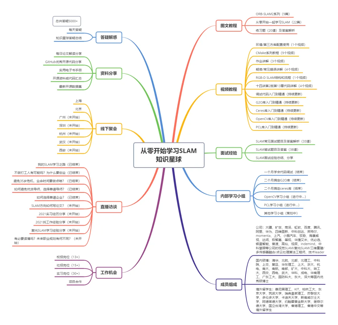 「从零开始学习SLAM」知识星球是全国最棒的SLAM/三维视觉学习社区,星球里包括入门图文/视频教程、学习过程疑难点解答、每日最新论文/开源代码/数据集分享、在线学习小组、笔试面试题、实习/校招/社招岗位推荐、星主直播交流等从入门到精通,从学生到职场的所有内容。见下图。很多小伙伴加入我们的知识星球后,感慨:“终于找到组织了!”