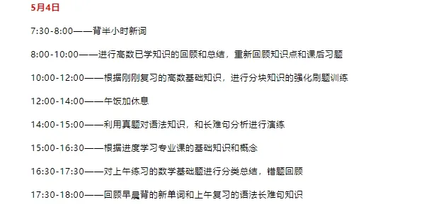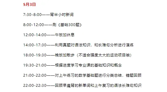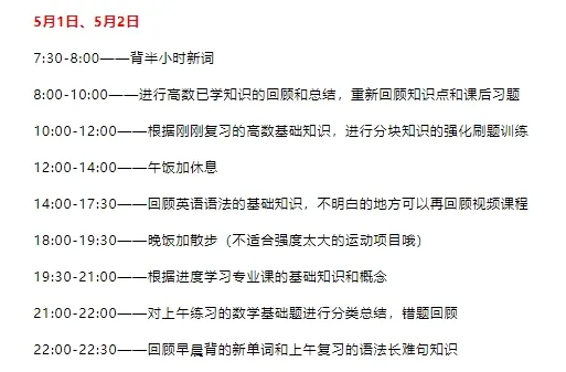 5月还是挺重要的一个节点(因为有一个小长假)大家对于假期是怎样安排的呢?可能有的同学要出去放松,还有的要继续在图书馆学习;今天考逻君会给大家梳理清楚25考研5月份的学习任务、参考进度和备考建议,以及五一假期的学习计划~一起来看看吧!考研英语5月份的主要复习计划是——疯狂的记单词,用词汇书加上app,争取一个月到40天之内把5500词都过一遍,这样后期就不会放弃,循环的时候比较熟悉。记单词最好方法就是放到阅读背景环境中去记忆。语法长难句:考研英语其实不用非常去钻牛角尖的语法,只要基本语法能懂,长难句会拆分就很厉害了。基本语法可以看一些老师的课程去学习一下,带学要比自学好一些。推荐唐叔,其他老师耶OK(适合自己的就是最好的!)如果英语基础非常好,可以试试做做早些年的阅读,看看难度。②阅读:得阅读者得考研英语,如果要考70分以上,阅读至少要30分,考试前的后期每一天都要坚持刷阅读(墙裂推荐唐叔《阅读的逻辑》!)③利用好真题:英语最好的复习资料就是30多年的真题,考英语一的也可以做英语二阅读,考英语二的也可以拿英语一阅读练手。英语一的阅的长难句比较多,比英语二难一些。有很多小伙伴反应2010年的英语一真题阅读最难。很多时候纠结要不要做教材,可以把教材作为参考,了解一些公式定理推导的来源;教材上题最好不要全部做,全部做很浪费时间,高数可以做做定积分和不定积分的习题,用来练习和记忆积分公式还是可以的。教材上的题与考研题风格相差太大了,辅导书的题有时候与考研真题风格也有出入。建议可以直接做自己的买的数学辅导书。也先不要碰真题,先从辅导书开始!!基础扎实,后期做题才好上手。5月份可以不看考研政治,视频课也不用看,看了也记不住,先把时间和精力放在英语和专业课上;政治目前要做的就是关注时政热点,积累素材。5月份需要整理出每一章的知识框架和重难点。一方面让自己对整本书的内容有个大概的了解,另一方面在后期复习时,用思维导图来回忆整体的章节框架及重要知识点也会更加高效。