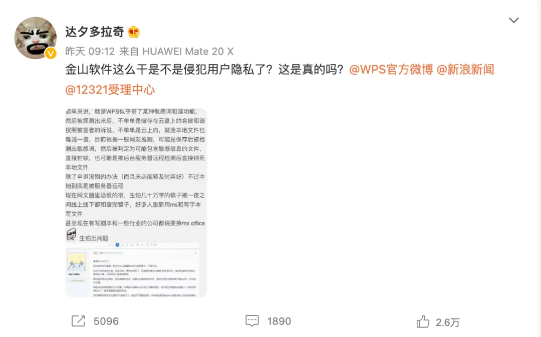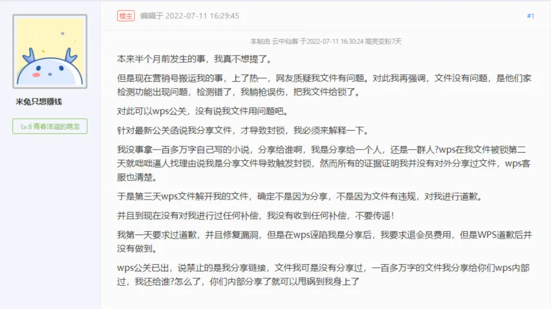 7月11日,认证信息为“作家,代表作《云草行》《死神手记》”的微博用户@达夕多拉奇 搬运网络文学交流互动平台“龙的天空”中的一则帖文,迅速获得多个网文写手大V转发关注,舆情热度随即迅速攀升。该微博质疑金山软件WPS侵犯用户隐私,配发论坛截图显示WPS用户“米兔只想赚钱”的小说文档被封锁、严禁访问,质疑WPS窥稿,进行举报维权。