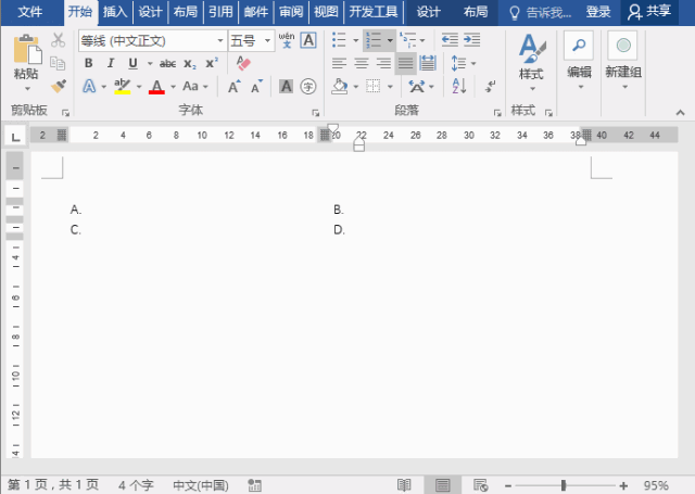 在选项A-B,C-D中间位置按【Tab】键添加一个制表符,将把光标后边的文字移到与标尺制表位对齐,具体操作如下图所示。