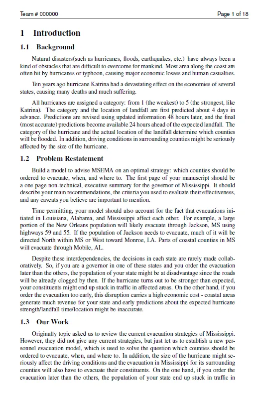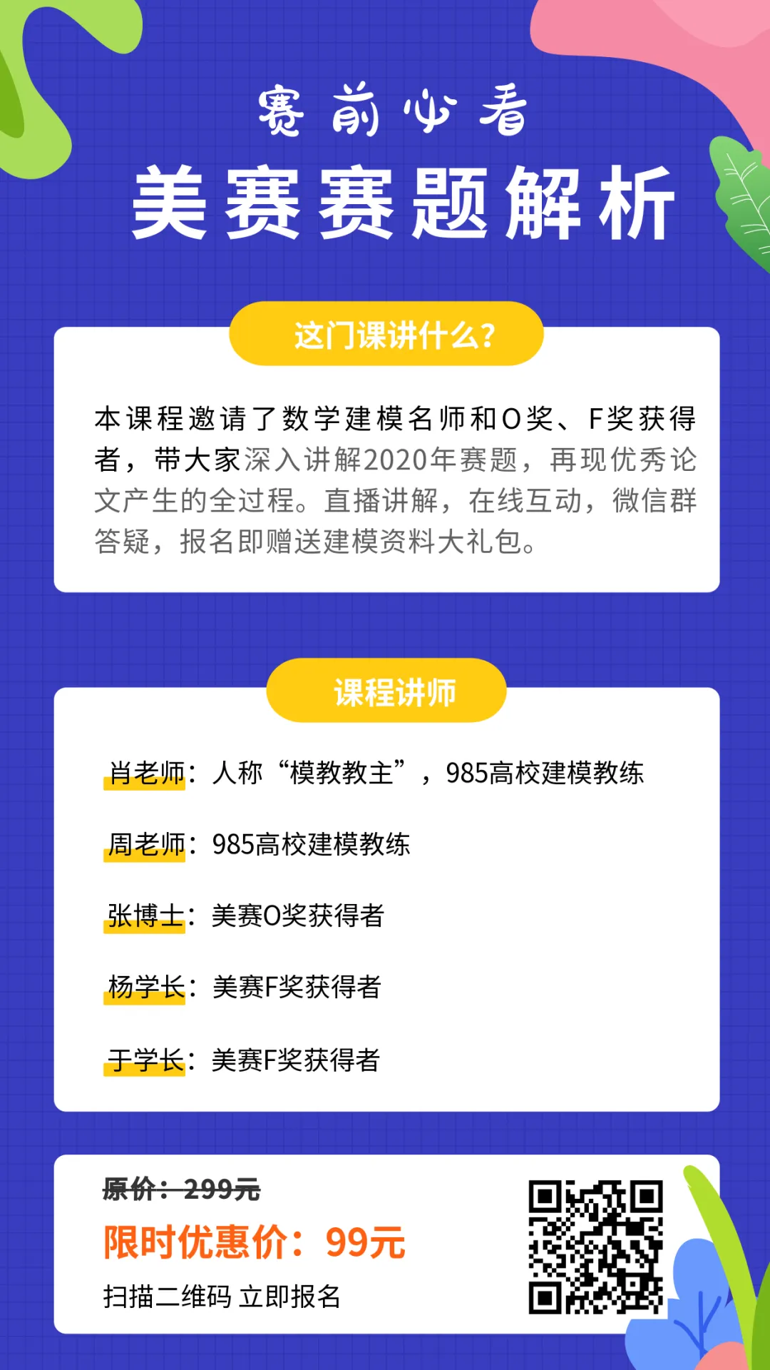 美国大学生数学建模竞赛(MCM/ICCM)是由美国数学及其联合会主办,是唯一的国际性数学建模竞赛,也是世界范围内最具影响力的数学建模竞赛。 赛题内容涉及经济、管理、环境、资源、生态、医学、安全等众多领域。 竞赛要求三人一组,在四天时间内,就指定的问题完成从建立模型、求解、验证到论文撰写的全部工作,体现了参赛选手研究问题、解决方案的能力及团队合作精神。 为现今各类数学建模竞赛之鼻祖。