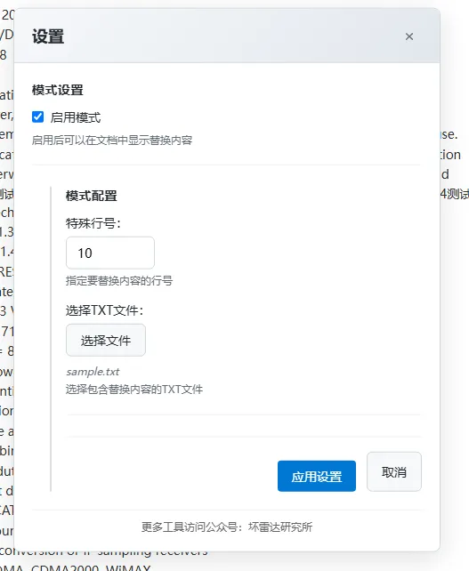 粘贴工作文档作为伪装(可以是任何工作相关的文字,文字越多越杂越好) 点击页面左上角的"文件"菜单,然后点击"设置" 在弹出的设置窗口中勾选"启用模式" 设置特殊行号(例如:输入10,则第10行开始显示你的小说内容) 点击"选择文件"按钮,选择你准备好的TXT文件 点击"应用设置"按钮开始阅读