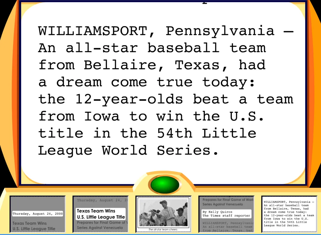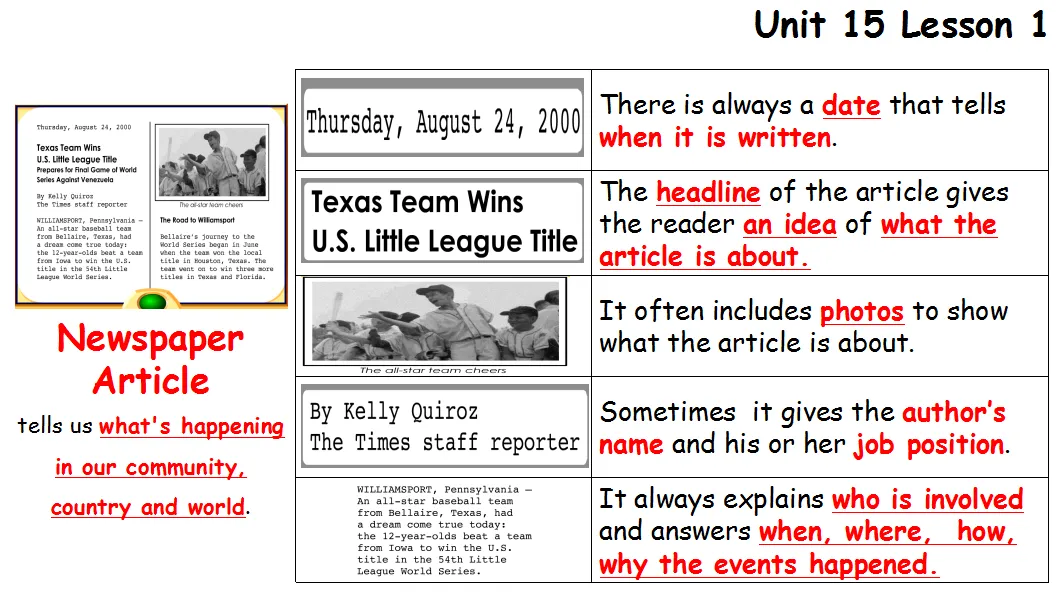 教学目标: 学生能识别newspaper article的文体定义,文体要素,认知报纸文章的结构要素包括:dates, headlines, photos, authors, and facts ; 以及问题要素的功能,并能在新的一篇文章当中找到相对应的文体要素体现,分析文章结构构成。