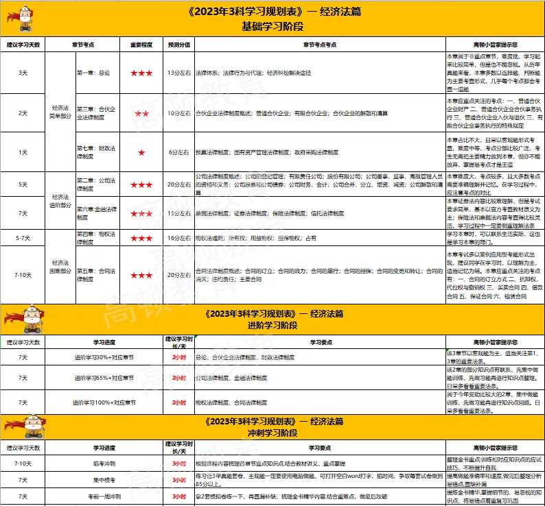 23年中级三科2-8月学习计划表.pdf“说真的,从我开始学习的那一刻起,就在想,怎么偷懒才能轻松点儿。”大家好,我是陪你备考中级的小顿。既然学习这件事情是注定的,那我们怎么学能轻松,是需要不断探索的。因此,今天给大家带来的内容是《 2023年中级三科备考规划表》。长按下方二维码,关注后先领取一波!扫描下方二维码即可自动获得高清打印版不同科目所需时间不同,为了保证复习进度与学习状态的统一,各个阶段应结合科目特征有所侧重。目前而言,针对有预习阶段备考规划需求的考生,酱子邀请高顿中级会计教研团队的老师,依照教材内容设置、与难度预测,设置了《会计实务》、《财务管理》、《经济法》三科学习规划表,下面简单展示规划表的模块内容:23年中级会计考试《会计实务》定制学习计划- 《会计实务》各章学习时间规划- 每章节超详尽学习技巧、提示- 按重要性区分1-3星级考点- 各章节重要程度、预计分值- 学习建议随时把控学习方向中级《会计实务》学习规划表中级会计实务是中级职称考试的基础性课程,难度较大,内容繁多,且综合性较强,与实务联系较为密切。中级会计实务的学习应注重对理论知识的理解,在理解的基础上应用于实际问题的处理中,因此建议考生仔细研读教材,应对考试的客观题,并通过做题将理论知识转换为实际应用,应对考试的主观题。简单预览领取高清完整版《 2023年中级三科备考规划表》扫描下方二维码,即可下载完整版中级《财务管理》学习规划表中级财务管理学科计算类题目较多,并且涵盖内容复杂,考试题型灵活多变,要求考生重点掌握计算类题目,并做大量的练习题来巩固知识点;本学科文字性内容相对较少,建议考生通读中级会计考试辅导教材。简单预览领取高清完整版《 2023年中级三科备考规划表》扫描下方二维码,即可下载完整版中级《经济法》学习规划表中级会计《经济法》是一门应用性较强的科目,把握法律具体规定的基础上,还比较注重考核大家对法律知识的理解和实际应用能力:简单预览领取高清完整版《 2023年中级三科备考规划表》扫描下方二维码,即可下载完整版人这一生,时间最公平,付出和回报是成正比的。没有凭空降临的好运,也没有一蹴而就的捷径,每个人都是通过自己的努力,去决定生活的样子。想要得到什么,就去付出足够的努力。祝大家好运!