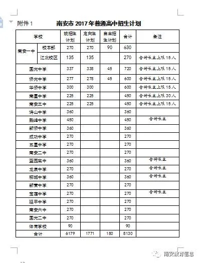 附件:1. 南安市2017年普通高中招生计划