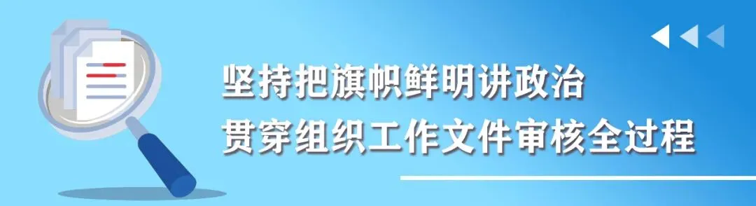 组织工作文件是发布党的组织工作政策主张、决策部署的重要载体。认真审核把关、确保文件质量,对各级党组织和广大党员干部准确把握文件内容、抓好文件落实,具有重要意义。近年来,中央组织部办公厅牢固树立政治机关意识,坚持以文辅政,严格把好组织工作文件政治政策关、法律法规关、文风文字关,在服务组织工作高质量发展上迈出了新步伐。