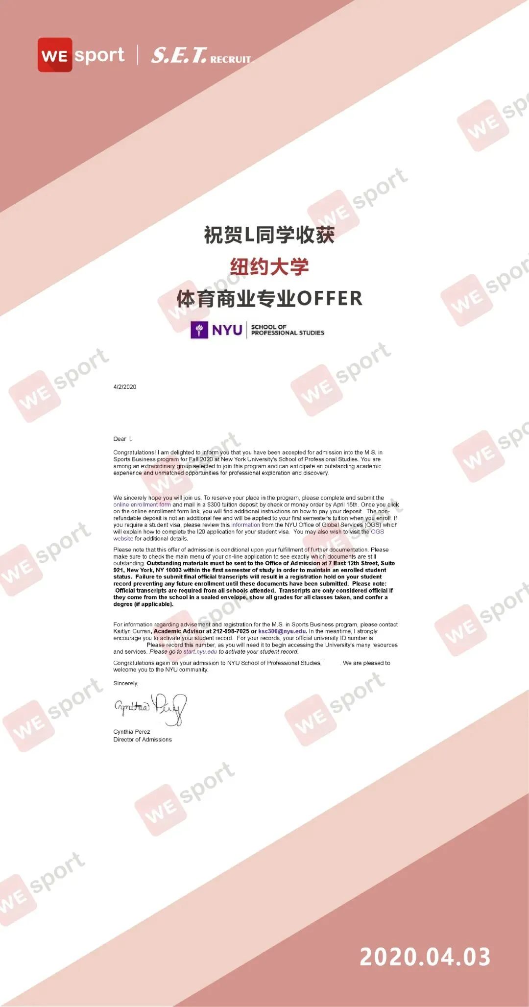 L同学本科就读于国内体育院校,标化成绩和语言成绩优秀,本硕毕业新闻媒体专业且有工作经验,基础背景条件十分优秀。