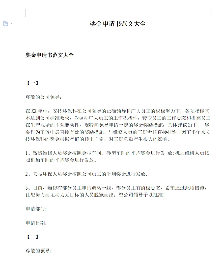 奖金申请书范文大全