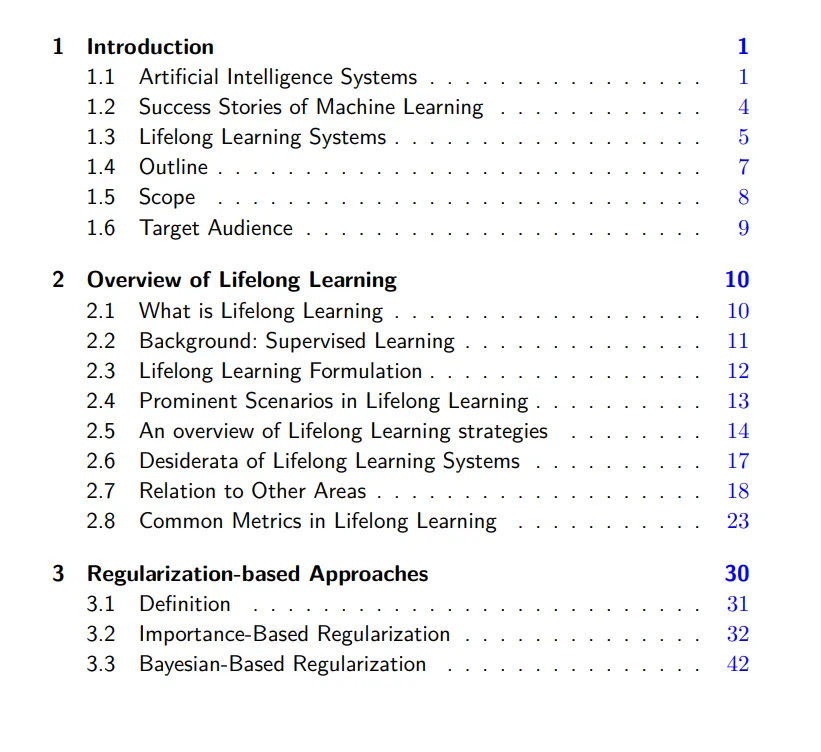 本入门书试图对终身学习的不同方面提供一个详细的总结。我们从第2章开始,它提供了终身学习系统的高级概述。在本章中,我们讨论了终身学习的主要场景(2.4节),介绍了不同终身学习方法的高层次组织(2.5节),列举了理想的终身学习系统(2.6节),讨论了终身学习与其他学习模式的关系(2.7节),描述了用于评估终身学习系统的常用指标(2.8节)。这一章对终身学习的新读者更有用,并希望在不关注具体方法或基准的情况下了解该领域。