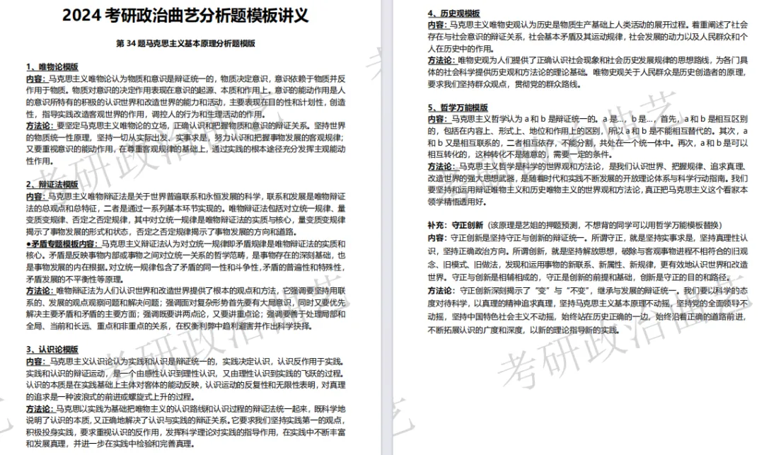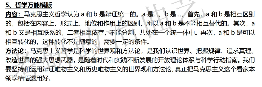 今天分享——曲艺分析题万能模板,现在就可以直接开背了!(PDF给大家整理好了,公众号后台回复:曲艺 获取)我相信大家绝大部分都是按照网上的经验贴复习的,就是12月之前不用看分析题,到时候直接背肖四就行了!(Ps:有同学纠结到底跟哪个老师分析题的,这里也简单提一嘴,市面上主流的肖徐腿三位老师,押题的准确率都是差不多的,整体命题核心都是相似的,紧跟住一个老师背就行)但是呢,这两年反押题又特别严重,所以补充背诵一些万能模板就很有必要了!看了一下,市面上本身出万能模板的老师就不多,少有的几个的模板也都写的很冗长,曲艺老师的是我能找到的写的最精简的!但是涵盖范围最广的,所以推荐你们去背一背!就拿马原举例,老师一共给了6个模板——唯物论、辩证法、认识论、历史观、哲学万能模板,以及一个今年押题的守正创新模板👇前5个是不是涵盖了100%马原能考到的题,毕竟再怎么反押题,也不可能不考这几个大原理里面的内容吧!