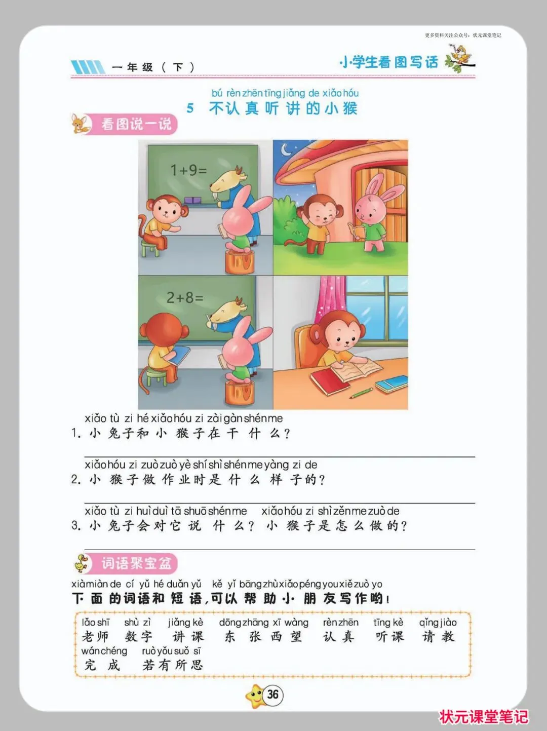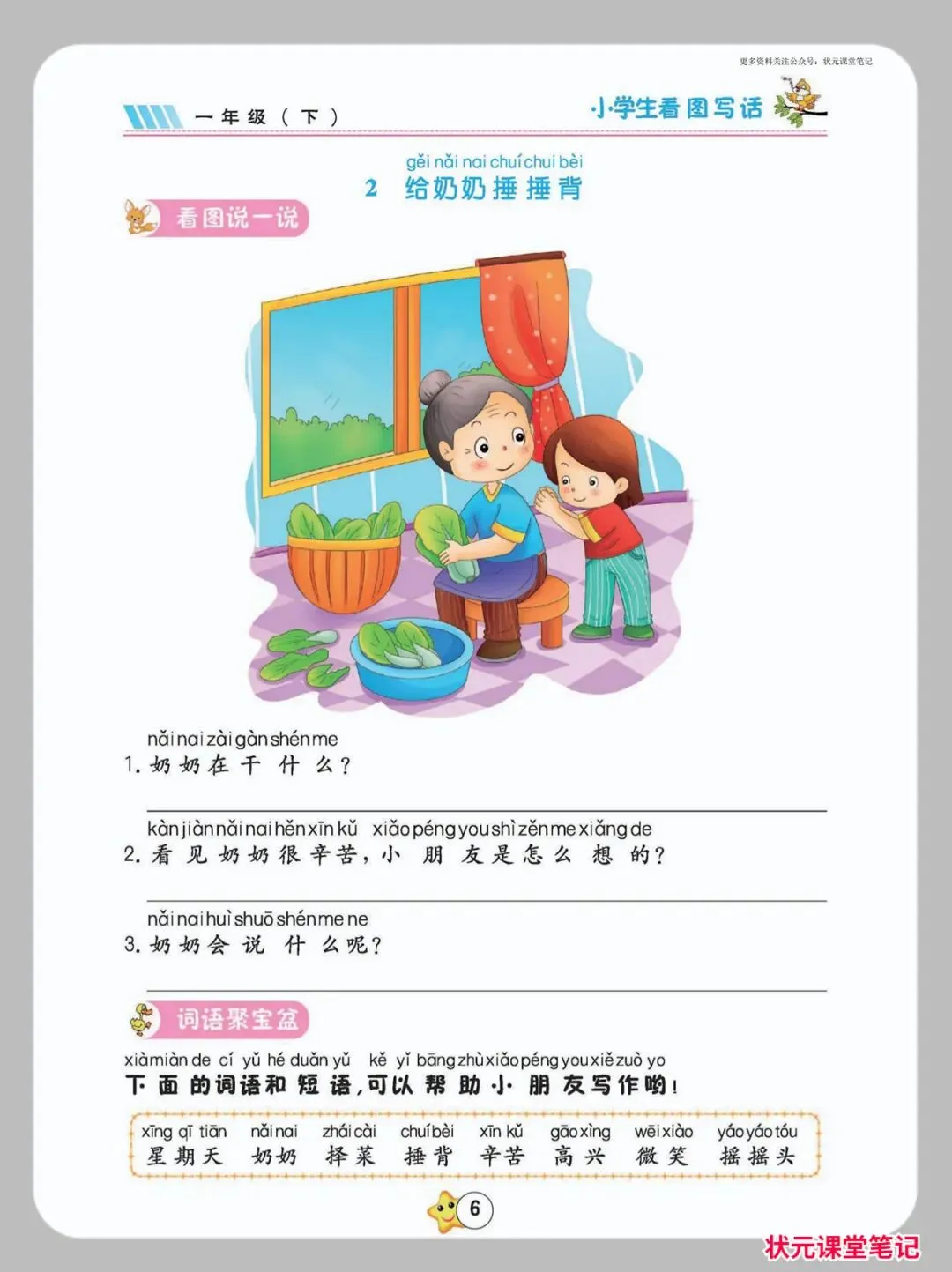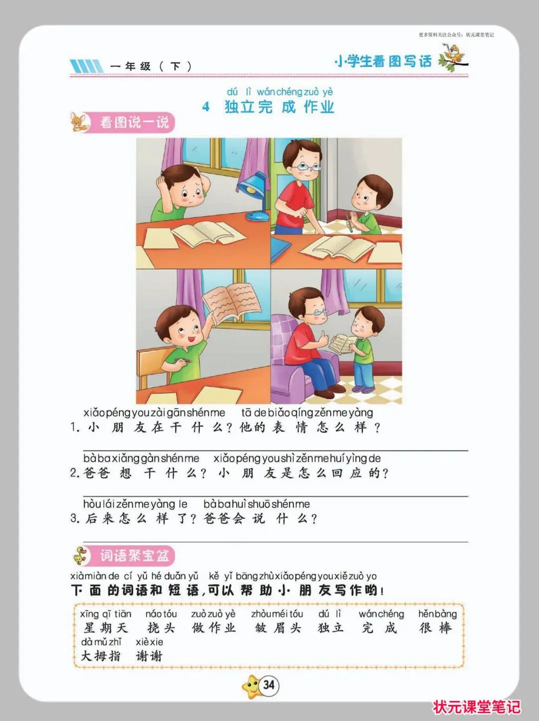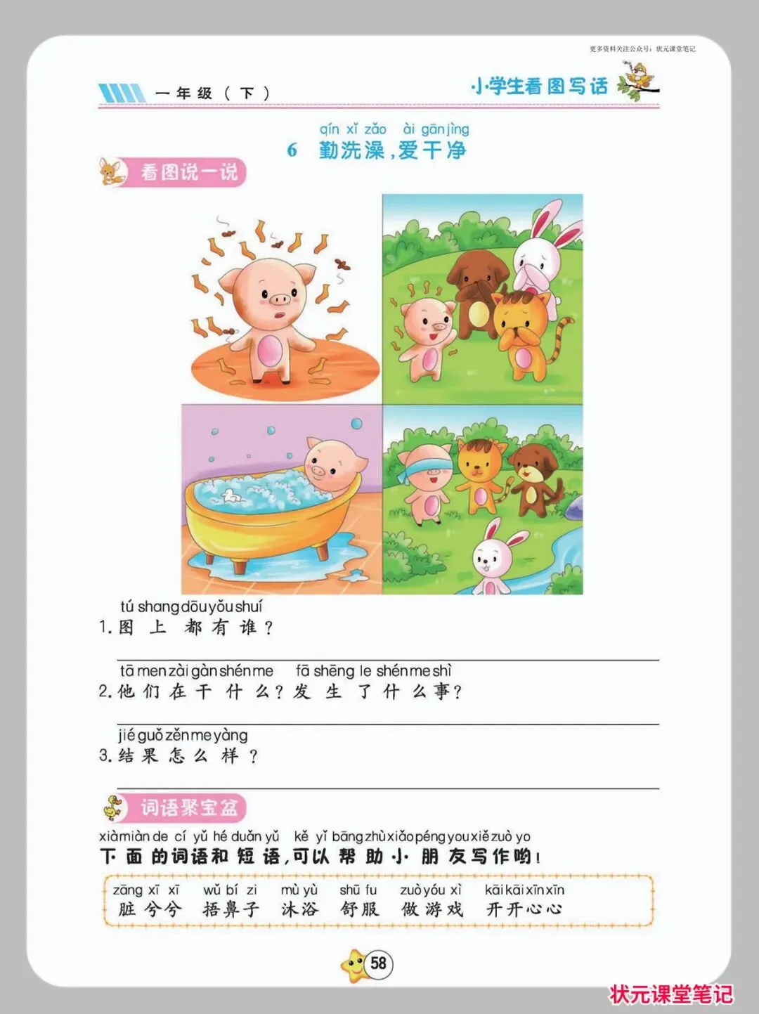 小学生一年级看图写话学习,PDF可打印!一年级就开始学习看图写话了,看图写话就是需要孩子多练习,多多练习会培养孩子写作的语感还有写作的技巧。获取pdf文档,关注公众号:状元课堂笔记回复:2022910自动获取文档链接