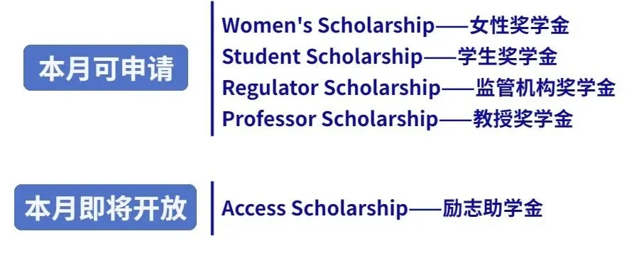 CFA奖学金从去年开始,5个奖学金项目,目前已经有4个可以申请了。那么最近,女性奖学金是刚刚开启申请通道,需要注意的是,它也是关闭最早的奖学金哦!满足条件的同学,一定要尽快去申请。