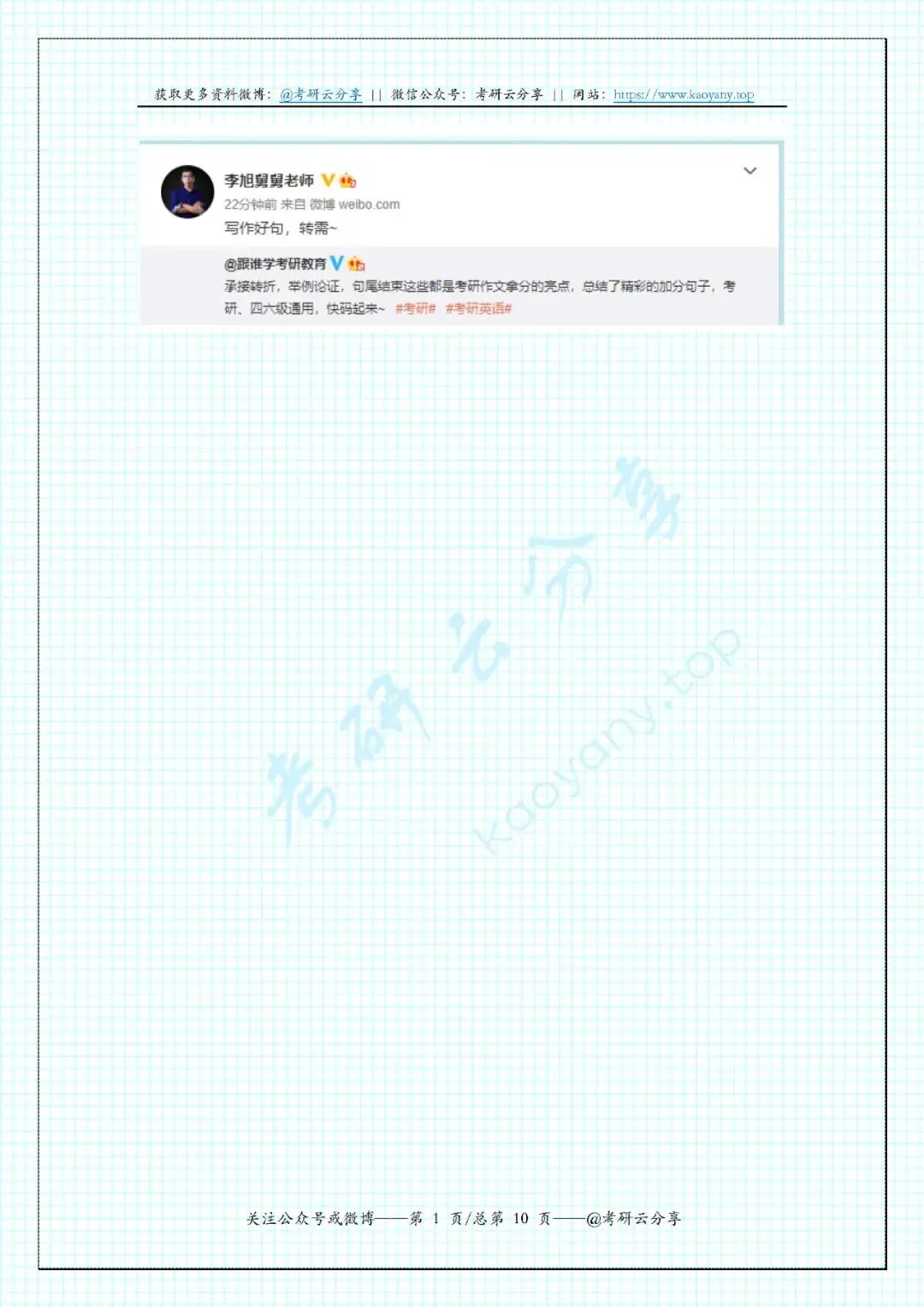 李旭:写作句子模板.pdf点击蓝色字"考研云分享"关注考研资讯回复"关键词",即可领取最新合集考研资料李旭:写作句子模板.pdf李旭:写作句子模板.pdf直接滑动即可在线查看,展示前20页完整文档扫下方二维码登录后免费下载@考研云分享「分享」你会分享给更多有需要的同学吗?