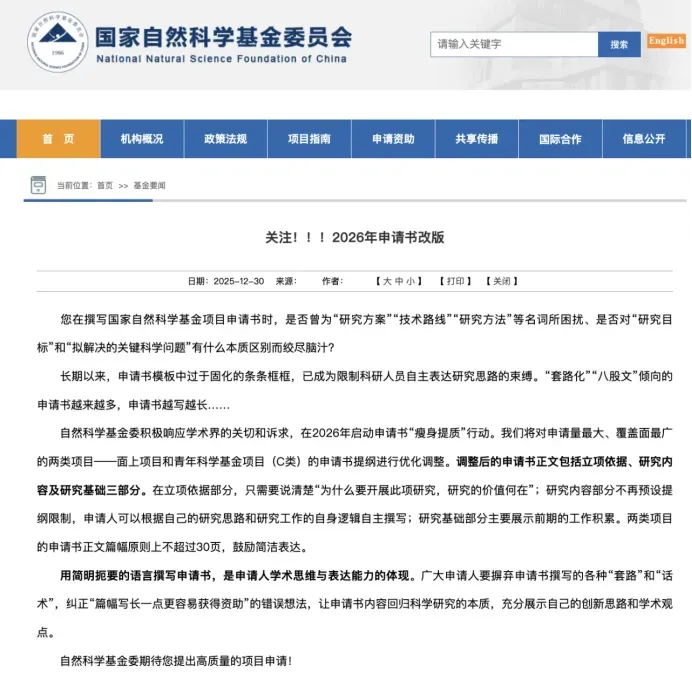 本次改革的核心在于,“瘦身提质”,基金委对申请量最大、覆盖面最广的两类项目——面上项目和青年科学基金项目(C类)的申请书提纲进行优化调整。调整后的申请书正文包括立项依据、研究内容及研究基础三部分。