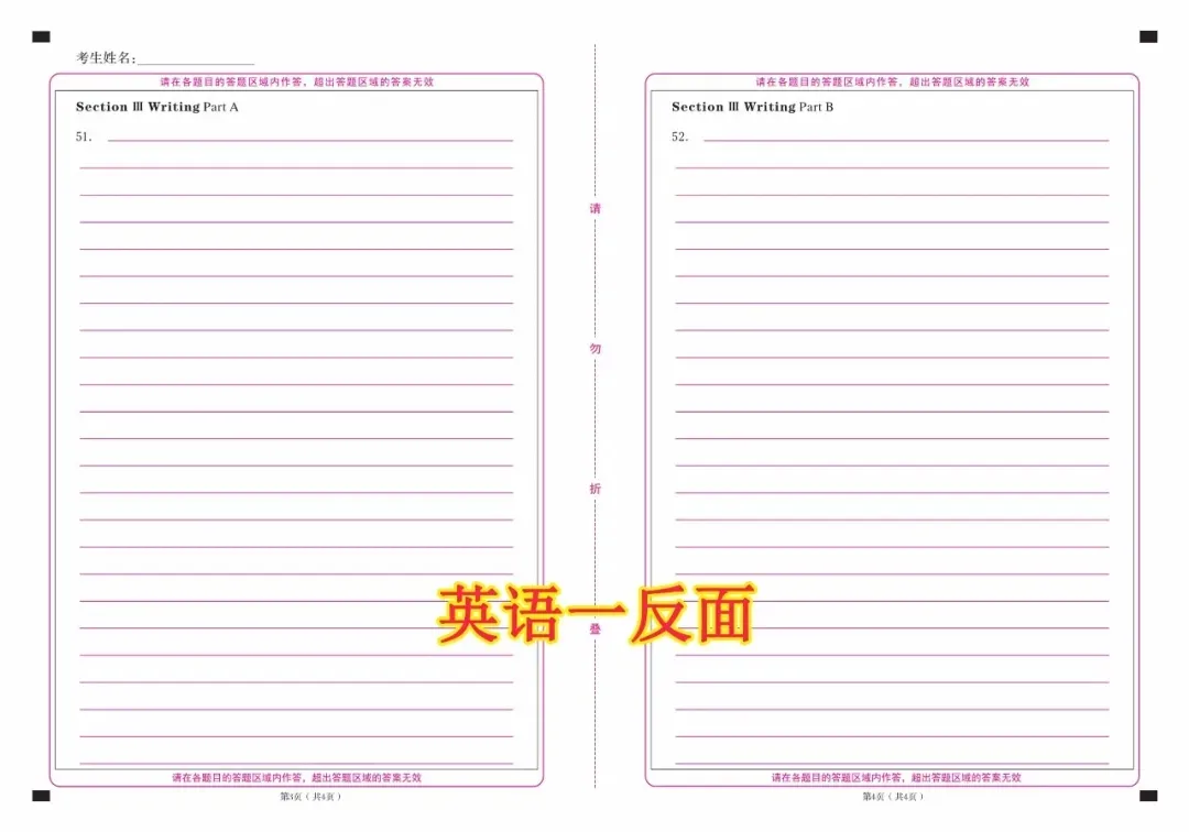 英语答题卡是1张纸(每一面分成2小页,共4页)。