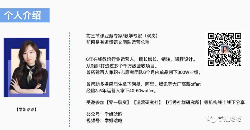 分享嘉宾:学姐晗晗,前三节课运营专家、前网易项目总监 ,帮助400+运营人求职上岸成功,运营3-6年人拿下40-60woffer,欢迎链接!