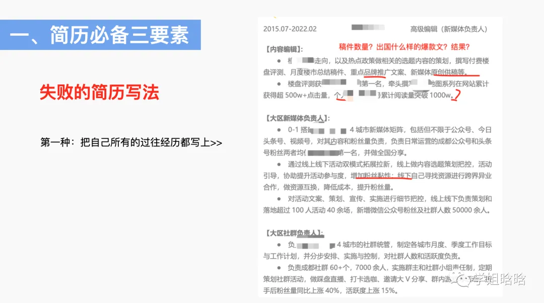 比如曾经我辅导一个教培行业做产品运营的伙伴转岗做电商私域的活动运营。她的能力是OK的,但是她的简历,舍不得把她之前做的那些成绩抛下,就导致活动运营能力的展示不够充分,所以找他的都是产品运营的,哪怕朋友帮她内推,简历也过不了。