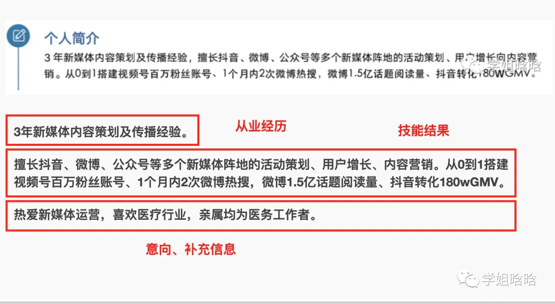 之前我给过一个公式:本行业或相关行业拥有的经验/技能+优秀结果呈现 (2行左右)