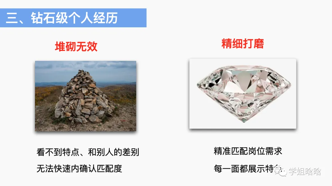 就好像一堆石头堆起来,只是一堆大小、颜色不一的随时。而如果像地下钻孔深挖,挖到钻石,并精细化打造切割面,你展示在招聘方眼前的每一面,都是它想要的闪光点。