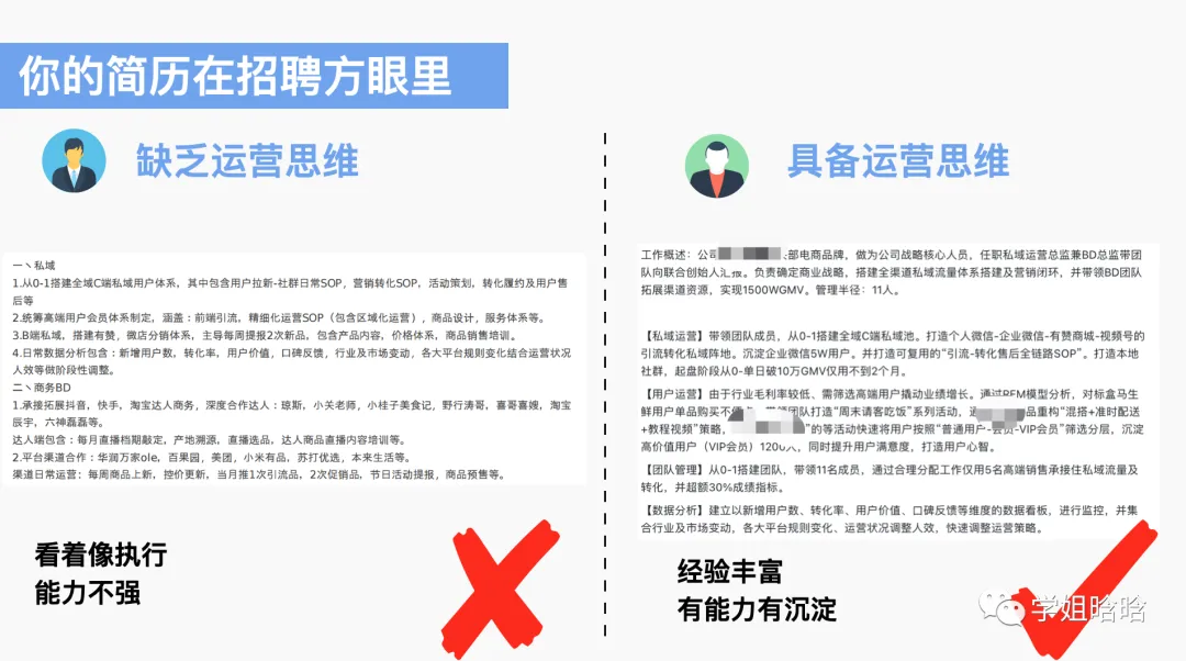 把运营思维理解成做事情的方法和模型。加入这个,你的简历就会发生翻天覆地的变化。能从石沉大海到hr看完简历。
