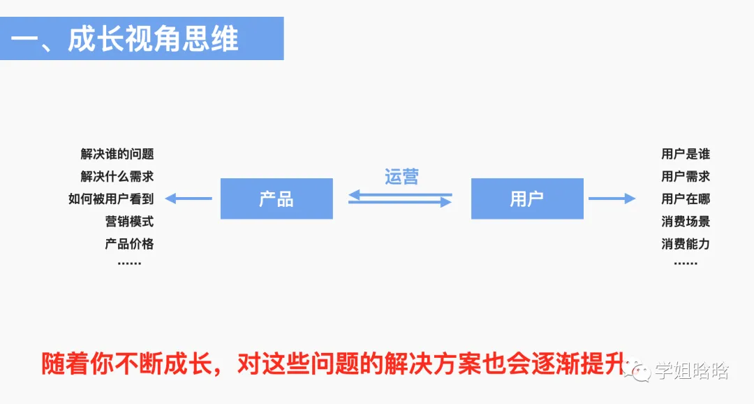 第1个我们现在从宏观层面,所有做运营的人都要接触到的是产品和用户,那我们所有动作围绕的都是用户需求,产品价值的传达。加上数据的支撑来指导我们的动作。