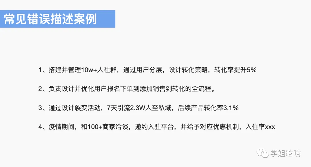 比如有很多做设计做私域的伙伴,经常会在简历中写搭建一个多大规模的社群,做用户分层、转化率提升多少。或者从用户报名下单到添加销售到转化的全流程。