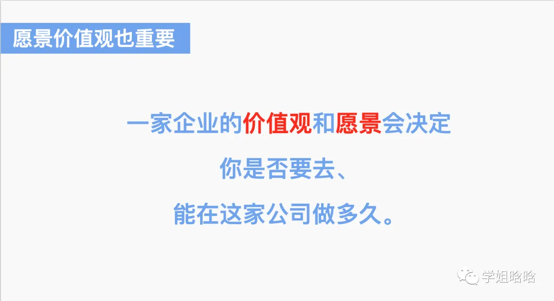最后,一家企业的价值观和愿景会决定你是否要去,和能在公司做多久。这一点是我观察自己从业经历发现的,在《斯坦福人生设计课》里找到同样的理论,也在这一年多的职场辅导中也经历过验证的。
