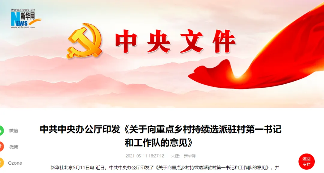 中央出台文件:持续选派驻村第一书记和工作队近日,中共中央办公厅印发了《关于向重点乡村持续选派驻村第一书记和工作队的意见》,并发出通知,要求各地区各部门结合实际认真贯彻落实。《关于向重点乡村持续选派驻村第一书记和工作队的意见》全文如下。为深入贯彻落实党中央有关决策部署,总结运用打赢脱贫攻坚战选派驻村第一书记和工作队的重要经验,在全面建设社会主义现代化国家新征程中全面推进乡村振兴,巩固拓展脱贫攻坚成果,把乡村振兴作为培养锻炼干部的广阔舞台,现就向重点乡村持续选派驻村第一书记和工作队提出如下意见。一、总体要求以习近平新时代中国特色社会主义思想为指导,深入贯彻党的十九大和十九届二中、三中、四中、五中全会精神,适应“三农”工作新形势新任务新要求,健全常态化驻村工作机制,为全面推进乡村振兴、巩固拓展脱贫攻坚成果提供坚强组织保证和干部人才支持。坚持有序衔接、平稳过渡,在严格落实脱贫地区“四个不摘”要求基础上,合理调整选派范围,优化驻村力量,拓展工作内容,逐步转向全面推进乡村振兴;坚持县级统筹、精准选派,按照先定村、再定人原则,由县级党委和政府摸清选派需求,统筹各级选派力量,因村派人、科学组队;坚持派强用好、严管厚爱,严格人选标准,加强管理监督,注重关心激励,确保选得优、下得去、融得进、干得好;坚持真抓实干、务求实效,推动第一书记和工作队员用心用情用力驻村干好工作,注意处理好加强外部帮扶与激发内生动力的关系,形成整体合力。二、选派范围对脱贫村、易地扶贫搬迁安置村(社区),继续选派第一书记和工作队,将乡村振兴重点帮扶县的脱贫村作为重点,加大选派力度。对其中巩固脱贫攻坚成果任务较轻的村,可从实际出发适当缩减选派人数。各地要选择一批乡村振兴任务重的村,选派第一书记或工作队,发挥示范带动作用。对党组织软弱涣散村,按照常态化、长效化整顿建设要求,继续全覆盖选派第一书记。对其他类型村,各地可根据实际需要作出选派安排。三、严格人选把关 第一书记和工作队员人选的基本条件是:政治素质好,坚决贯彻执行党的理论和路线方针政策,热爱农村工作;工作能力强,敢于担当,善于做群众工作,具有开拓创新精神;事业心和责任感强,作风扎实,不怕吃苦,甘于奉献;具备正常履职的身体条件。第一书记必须是中共正式党员,具有1年以上党龄和2年以上工作经历;工作队员应优先选派中共党员。第一书记和工作队员主要从省市县机关优秀干部、年轻干部,国有企业、事业单位优秀人员和以往因年龄原因从领导岗位上调整下来、尚未退休的干部中选派,有农村工作经验或涉农方面专业技术特长的优先。中央和国家机关各部委、人民团体、中管金融企业、国有重要骨干企业和高等学校,有定点帮扶和对口支援结对任务的,每个单位至少选派1名优秀干部到村任第一书记。选派第一书记和工作队员,按照个人报名和组织推荐相结合的办法,由派出单位组织人事部门提出人选,同级党委组织部门会同农办、农业农村部门及乡村振兴部门进行备案,派出单位党委(党组)研究确定。各地区各部门各单位党委(党组)及组织部门、农办、农业农村部门及乡村振兴部门,要严把人选政治关、品行关、能力关、作风关、廉洁关,充分考虑年龄、专业、经历等因素,确保选优派强。县级党委和政府要根据不同类型村的需要,对人选进行科学搭配、优化组合,发挥选派力量的最大效能。 四、主要职责任务根据全面推进乡村振兴、巩固拓展脱贫攻坚成果任务需要,第一书记和工作队主要做好以下工作。(一)建强村党组织。重点围绕增强政治功能、提升组织力,推动村干部、党员深入学习和忠实践行习近平新时代中国特色社会主义思想,学习贯彻党章党规党纪和党的路线方针政策;推动加强村“两委”班子建设、促进担当作为,帮助培育后备力量,发展年轻党员,吸引各类人才;推动加强党支部标准化规范化建设,严格党的组织生活,加强党员教育管理监督,充分发挥党组织和党员作用。 (二)推进强村富民。重点围绕加快农业农村现代化、扎实推进共同富裕,推动巩固拓展脱贫攻坚成果,做好常态化监测和精准帮扶;推动加快发展乡村产业,发展壮大新型农村集体经济,促进农民增收致富;推动农村精神文明建设、生态文明建设、深化农村改革、乡村建设行动等重大任务落地见效,促进农业农村高质量发展。 (三)提升治理水平。重点围绕推进乡村治理体系和治理能力现代化、提升乡村善治水平,推动健全党组织领导的自治、法治、德治相结合的乡村治理体系,加强村党组织对村各类组织和各项工作的全面领导,形成治理合力;推动规范村务运行,完善村民自治、村级议事决策、民主管理监督、民主协商等制度机制;推动化解各类矛盾问题,实行网格化管理和精细化服务,促进农村社会和谐稳定。 (四)为民办事服务。重点围绕保障和改善农村民生、密切党群干群关系,推动落实党的惠民政策,经常联系走访群众,参与便民利民服务,帮助群众解决“急难愁盼”问题;推动加强对困难人群的关爱服务,经常嘘寒问暖,协调做好帮扶工作;推动各类资源向基层下沉、以党组织为主渠道落实,不断增强人民群众获得感、幸福感、安全感。 第一书记和工作队要从派驻村实际出