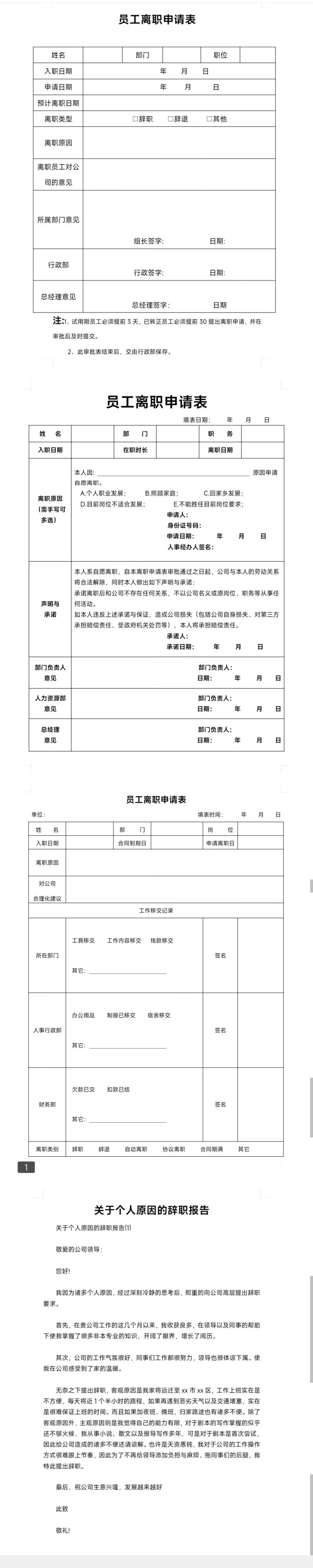 员工离职申请表、个人离职报告……