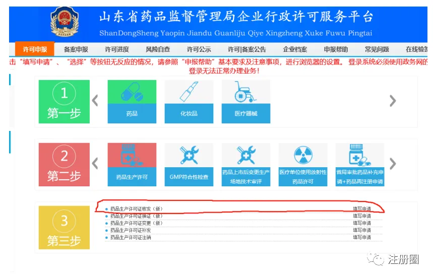 1.2《药品生产监督管理办法》(2020年第47号)附件1规定的药品生产许可证申请材料清单如下:2.基本情况,包括企业名称、生产线、拟生产品种、剂型、工艺及生产能力(含储备产能);3.企业的场地、周边环境、基础设施、设备等条件说明以及投资规模等情况说明;4.营业执照(申请人不需要提交,监管部门自行查询);5.组织机构图(注明各部门的职责及相互关系、部门负责人);6.法定代表人、企业负责人、生产负责人、质量负责人、质量受权人及部门负责人简历、学历、职称证书和身份证(护照)复印件;依法经过资格认定的药学及相关专业技术人员、工程技术人员、技术工人登记表,并标明所在部门及岗位;高级、中级、初级技术人员的比例情况表;7.周边环境图、总平面布置图、仓储平面布置图、质量检验场所平面布置图;8.生产工艺布局平面图(包括更衣室、盥洗间、人流和物流通道、气闸等,并标明人、物流向和空气洁净度等级),空气净化系统的送风、回风、排风平面布置图,工艺设备平面布置图;10.拟生产剂型及品种的工艺流程图,并注明主要质量控制点与项目、拟共线生产情况;11.空气净化系统、制水系统、主要设备确认或验证概况;生产、检验用仪器、仪表、衡器校验情况;16.凡申请企业申报材料时,申请人不是法定代表人或负责人本人,企业应当提交《授权委托书》;中药饮片等参照自行生产的药品上市许可持有人申请要求提交相关资料。疫苗上市许可持有人还应当提交疫苗的储存、运输管理情况,并明确相关的单位及配送方式。2.1 想要申请药品生产许可证,营业执照必须有药品生产范围。2.2 建立质量管理体系并按照材料清单准备申报材料。2.3 与药品监督管理局(分局或省局)进行沟通,填写申请药品生产许可证的报告(模板见附件1),待药品监督管理局同意回复后,登录山东省药品监督管理局官网http://mpa.shandong.gov.cn/,寻找如下窗口:
