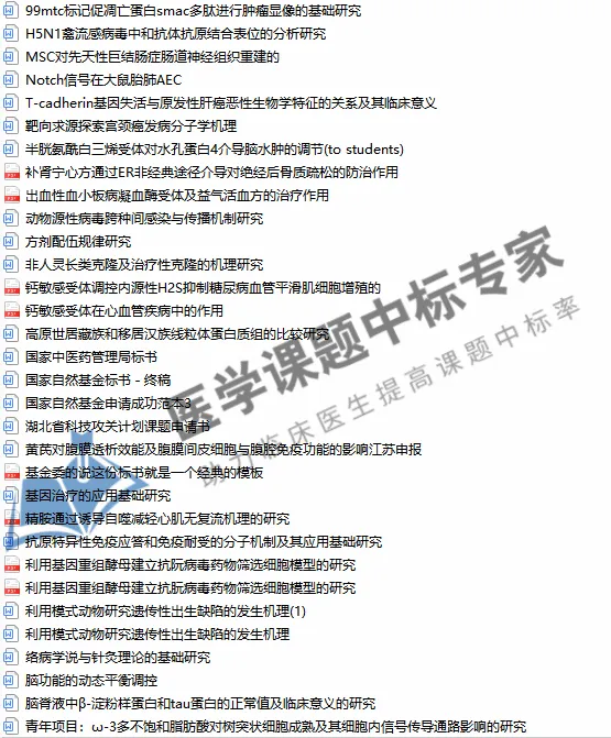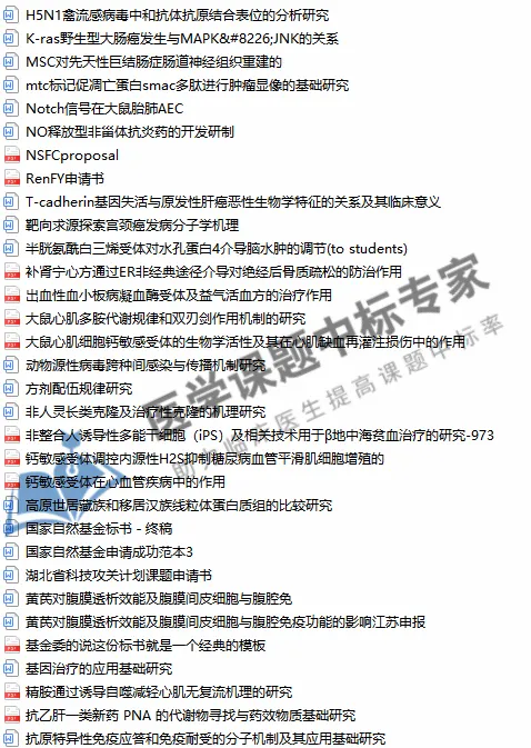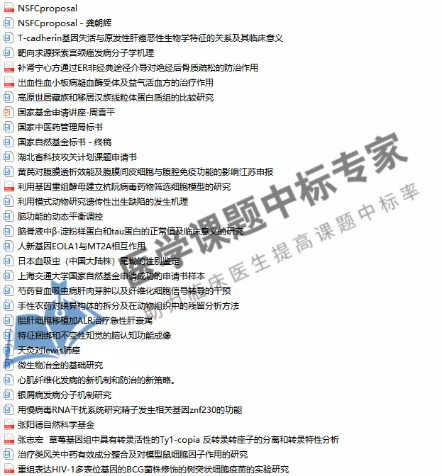 历年已中标的200余份标书全文,包含:生物类(含非生物类),动物类,植物类,医学类,青年、面上、杰青的标书全文。内容太多,就不一一截图了,部分截图如下(约2个G):