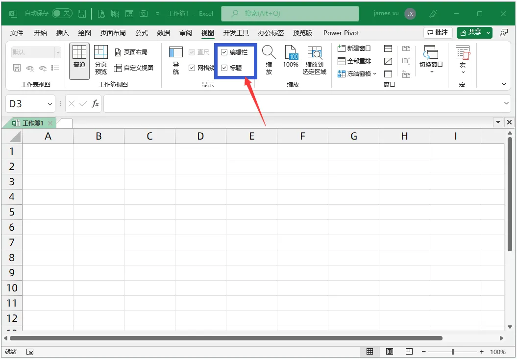 在视图中,选择编辑栏和标题,这两个√选择上,