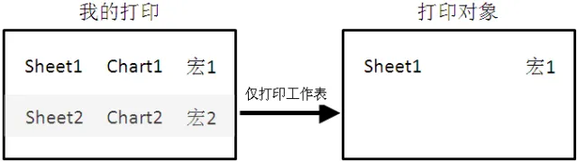 “仅打印工作表“,这里的工作表包括工作表和宏表,忽略图表,并且跳过隐藏的工作表和宏表。